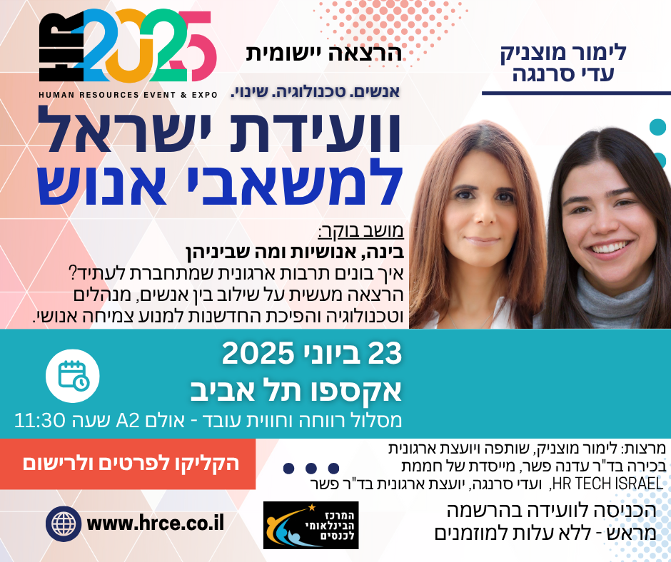 מרצות: לימור מוצניק, שותפה ויועצת ארגונית בכירה בקבוצת ד"ר עדנה פשר ושות', מייסדת-שותפה של חממת HR TECH ISRAEL ועדי סרנגה, יועצת ארגונית, קבוצת ד"ר פשר